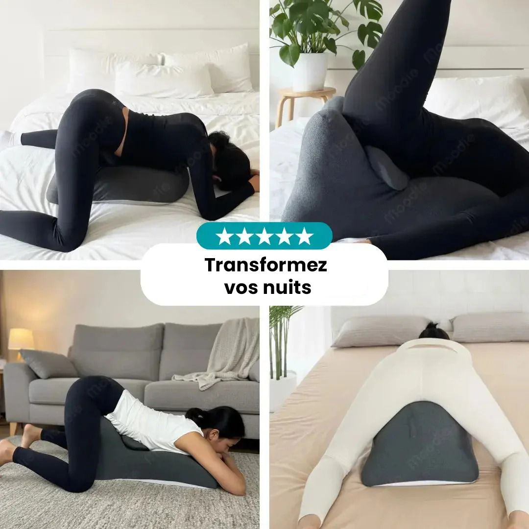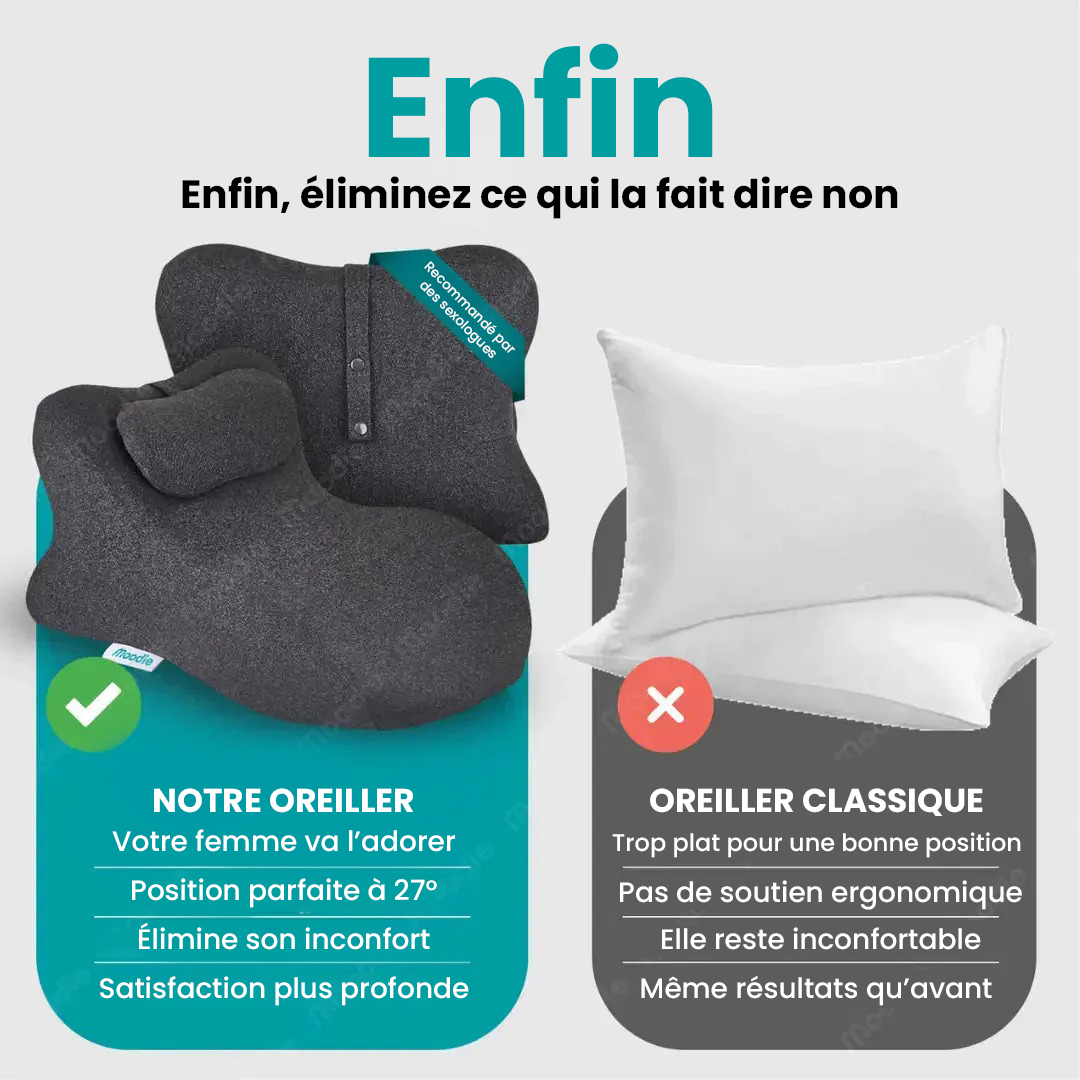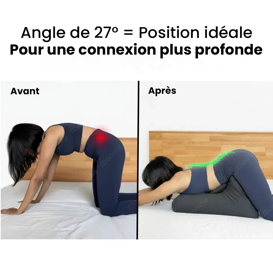 Le coussin Moodie Intimacy est conçu avec précision à 27° — l’angle exact qui supprime les tensions et améliore la position. Quand l’inconfort physique disparaît, le désir naturel revient souvent.